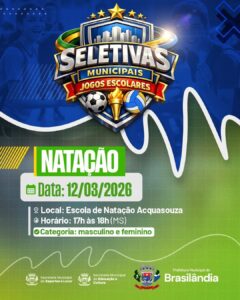 A Secretaria Municipal de Esporte e Lazer deu início às seletivas para definir os atletas que irão representar Brasilândia nos Jogos Escolares 2026. Neste momento, estão sendo realizadas as seletivas para as seguintes modalidades: NATAÇÃO De 12 de março na Escola de Natação Acquasouza das 17h às 18h Categoria: feminino, Idade: 12 a 17 anos XADREZ De 09 a 13 de março na Escola Municipal Antônio Henrique Filho das 07h30 às 16h Categorias: masculino e feminino, Idade: 12 a 17 anos Fique atento: em breve serão divulgadas as seletivas das…