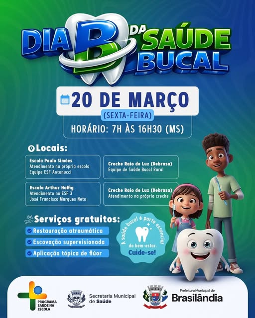 A Prefeitura de Brasilândia, por meio da Secretaria Municipal de Saúde, convida os alunos do Programa Saúde na Escola para um dia especial dedicado ao cuidado com o sorriso! 20 de março de 2026 (sexta-feira) 7h às 16h30 (MS) SERVIÇOS OFERECIDOS: Mutirão de restauração atraumática Escovação supervisionada Aplicação tópica de flúor VENHA CUIDAR DO SEU SORRISO!