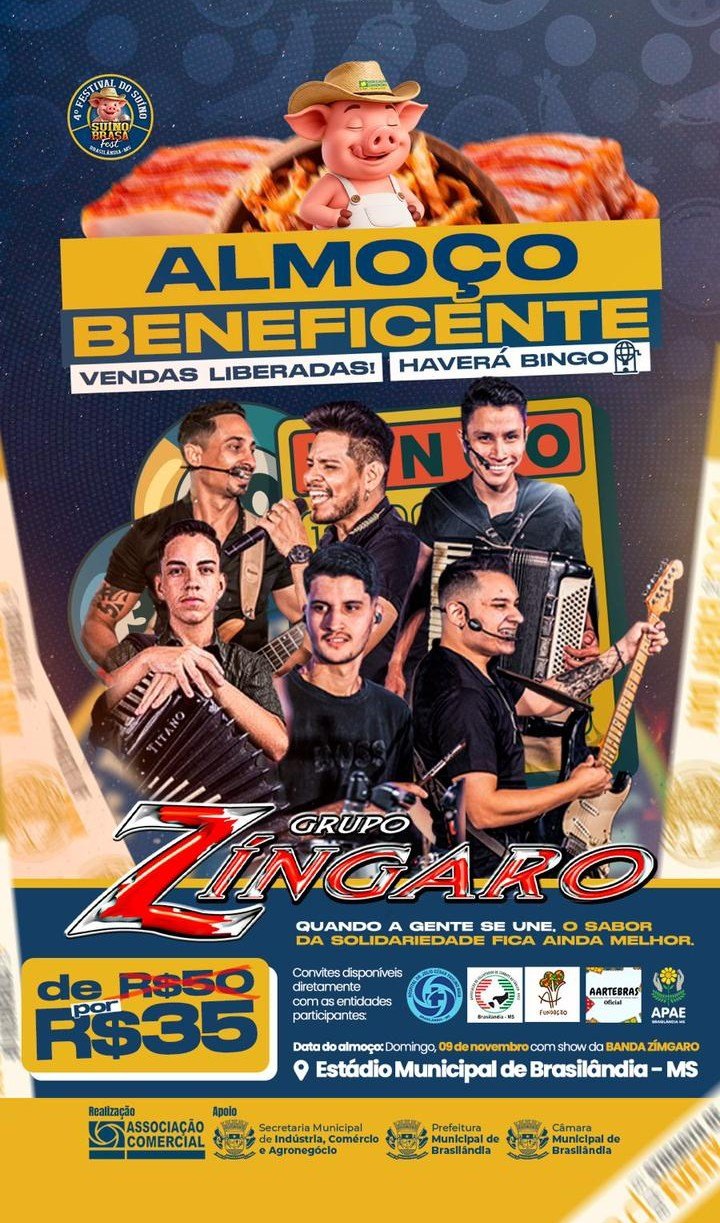 No domingo (09), será realizado o almoço beneficente no Estádio Municipal, com valor promocional de R$ 35. Os convites estão à venda diretamente com as entidades participantes – Hospital Júlio César Paulino Maia, Fundação de Saúde Pública de Brasilândia e AArtebras – e a renda será integralmente revertida para estas instituições. O almoço inclui show da Banda Zíngaro.