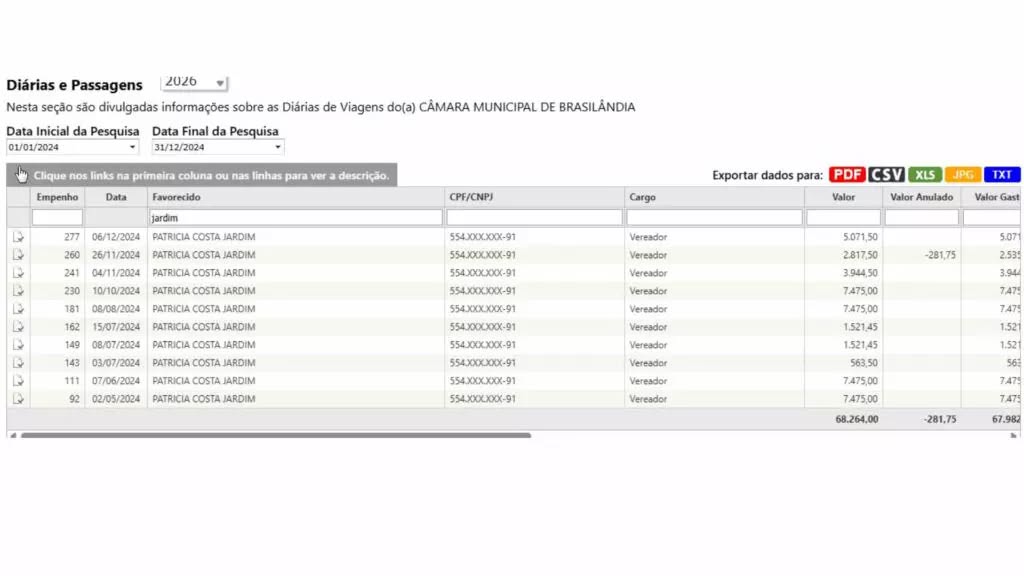 Denúncia anônima pediu apuração sobre o fato de a ex-presidente da Câmara Municipal, vereadora Patrícia Costa Jardim (PP) — atual secretária de Administração do município —, ter gastado 22% desse total. Ou seja, somente ela recebeu R$ 68.264,00 no ano passado. Este ano, ela não conseguiu se reeleger, ficando apenas como suplente.