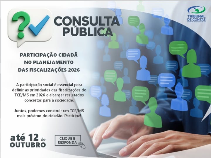 As contribuições podem ser enviadas até 12 de outubro através do questionário disponível no site do TCE-MS (https://www.tce.ms.gov.br/formularios2/index.php/245887…). Não é necessário cadastro – basta escolher as áreas consideradas prioritárias para fiscalização. As sugestões serão consolidadas pela Diretoria de Controle Externo e servirão de base para o Plano Anual de Fiscalização de 2026.