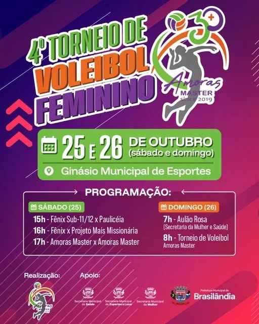 A bola vai rolar – ou melhor, vai ser cortada, levantada e sacada – para um público especial no último final de semana de outubro em Brasilândia. Nos dias 25 e 26, o Ginásio Municipal de Esportes será palco do 4º Torneio de Voleibol Amoras Master, evento exclusivo para mulheres acima de 30 anos que reúne esporte, saúde e empoderamento feminino em uma iniciativa apoiada pela Prefeitura Municipal através de três secretarias: Esportes e Lazer, Saúde e da Mulher.