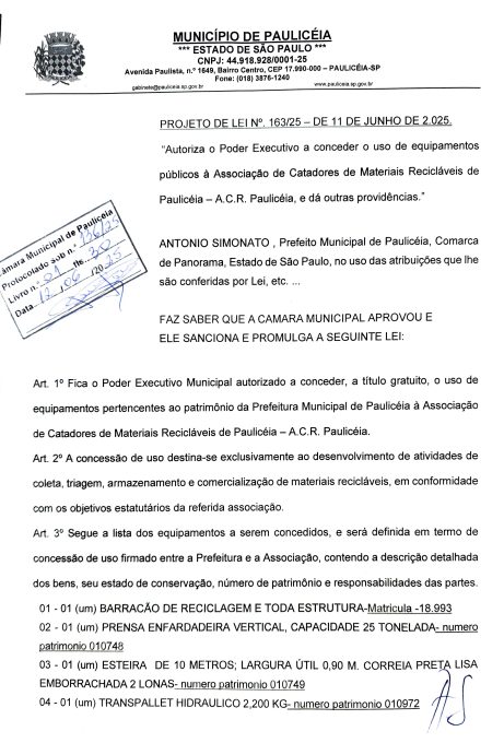 Art. 1° Fica o Poder Executivo Municipal autorizado a conceder, a titulo gratuito, o uso de equipamentos pertencentes ao patrimônio da Prefeitura Municipal de Paulicéia à Associação de Catadores de Materiais Recicláveis de Paulicéia – A.C.R. Paulicéia.