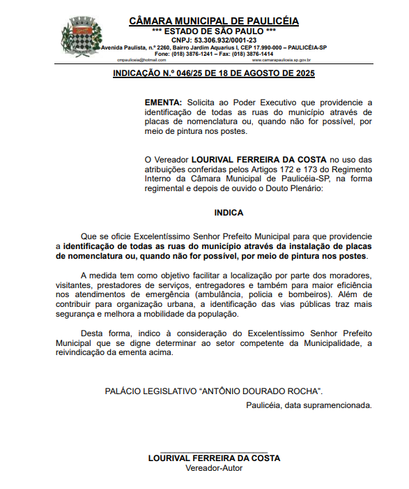A medida tem como objetivo facilitar a localização por parte dos moradores, visitantes, prestadores de serviços, entregadores e também para maior eficiência nos atendimentos de emergência (ambulância, policia e bombeiros). Além de contribuir para organização urbana, a identificação das vias públicas traz mais segurança e melhora a mobilidade da população.