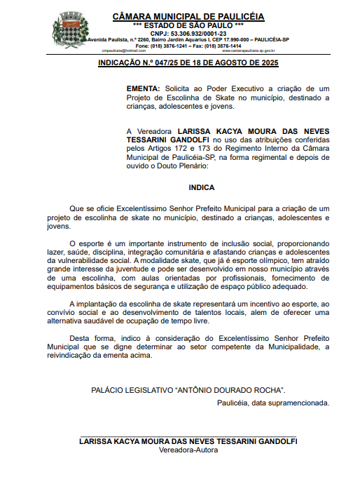 O esporte é um importante instrumento de inclusão social, proporcionando lazer, saúde, disciplina, integração comunitária e afastando crianças e adolescentes da vulnerabilidade social. A modalidade skate, que já é esporte olímpico, tem atraído grande interesse da juventude e pode ser desenvolvido em nosso município através de uma escolinha, com aulas orientadas por profissionais, fornecimento de equipamentos básicos de segurança e utilização de espaço público adequado.