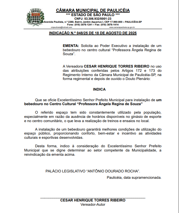Que se oficie Excelentíssimo Senhor Prefeito Municipal para instalação de um bebedouro no Centro Cultural “Professora Ângela Regina de Souza”.