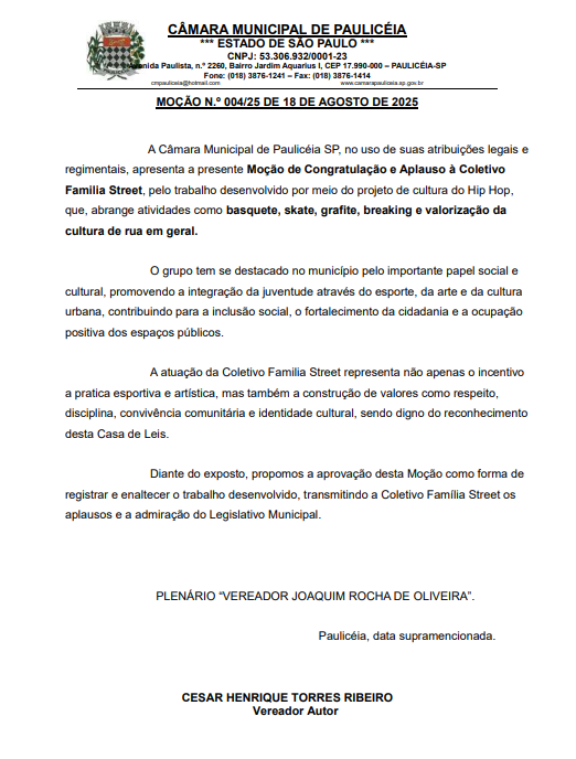 Familia Street, pelo trabalho desenvolvido por meio do projeto de cultura do Hip Hop,