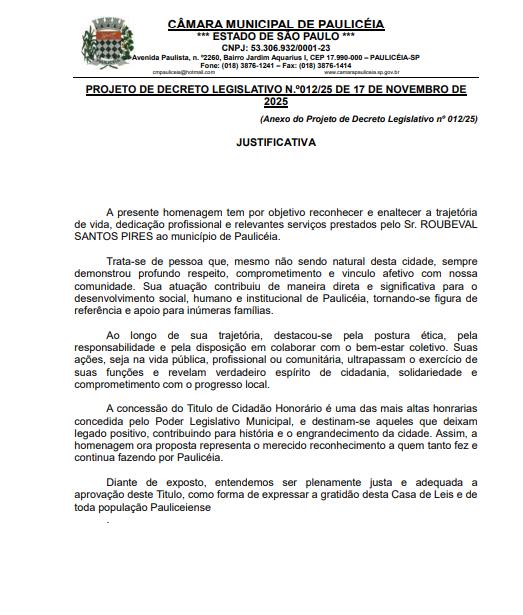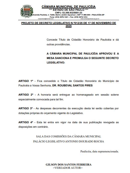 CÂMARA MUNICIPAL DE PAULICÉIA SP 4 de dezembro de 202524 de dezembro de 2025 Diário Notícias Concede Título de Cidadão Honorário de Paulicéia e dá outras providências. Artigo 1º – Fica concedido o Título de Cidadão Honorário do Município de Paulicéia a Vossa Senhoria, DR. ROUBEVAL SANTOS PIRES Vereador autor: Gilson dos Santos Ferreira