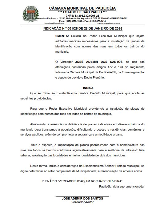 Atualmente, a ausência ou deficiência de placas indicativas em diversos bairros do município gera transtornos à população, dificultando o acesso a residências, comércios e serviços públicos, além de comprometer a segurança e a mobilidade urbana.