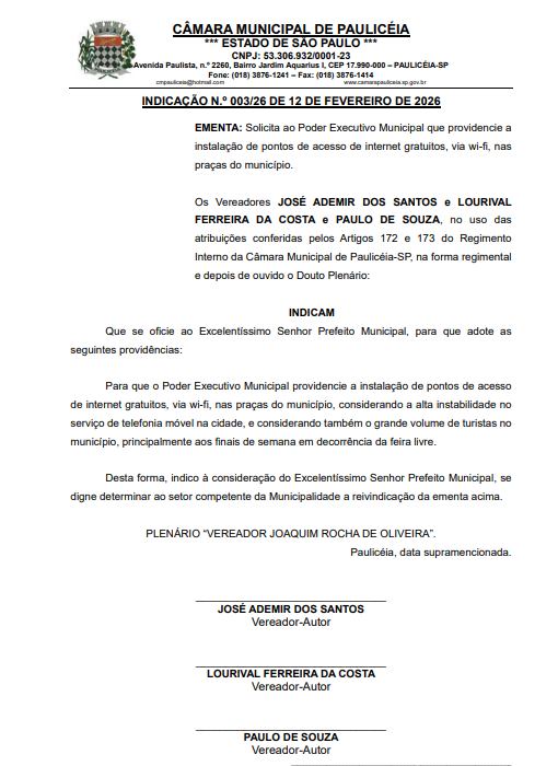 Os vereadores José Ademir dos Santos, Lourival Ferreira da Costa e Paulo de Souza, no uso das atribuições conferidas pelos Artigos 172 e 173 do Regimento Interno da Câmara Municipal de Paulicéia-SP, na forma regimental e depois de ouvido o Douto Plenário: