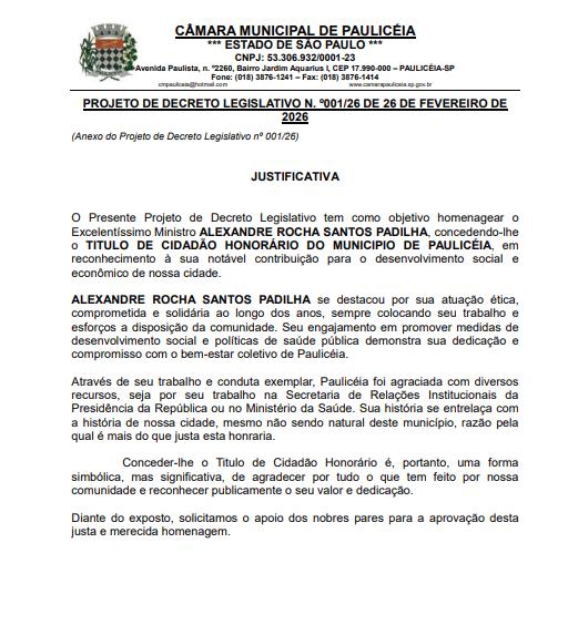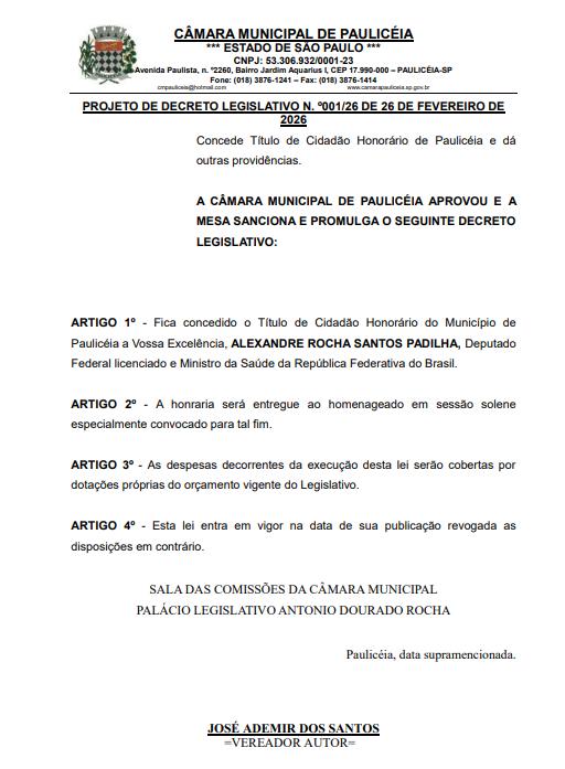 Paulicéia a Vossa Excelência, ALEXANDRE ROCHA SANTOS PADILHA, Deputado Federal licenciado e Ministro da Saúde da República Federativa do Brasil.