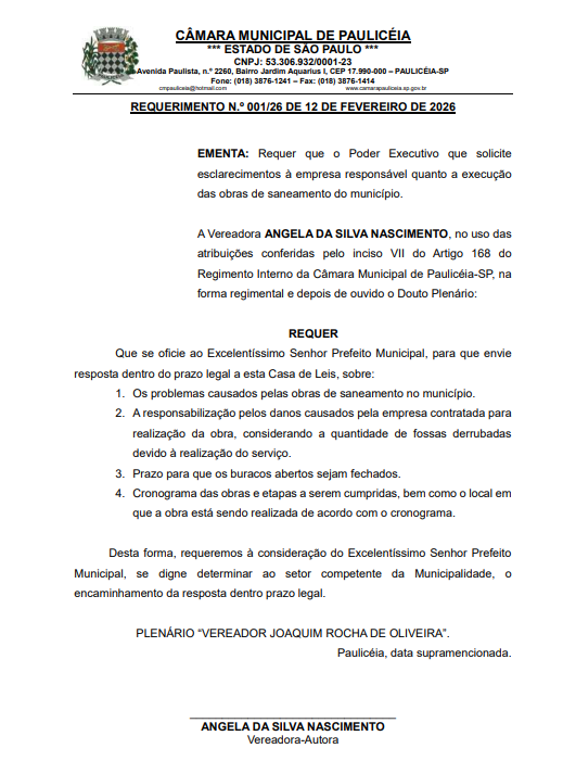 Requer que o Poder Executivo que solicite esclarecimentos à empresa responsável quanto a execução das obras de saneamento do município.