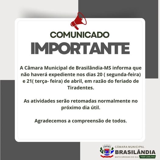 A Câmara Municipal de Brasilândia-MS informa que não haverá expediente nos dias 20 ( segunda-feira) e 21( terça-feira) de abril, em razão do feriado de Tiradentes. As atividades serão retomadas normalmente no próximo dia útil. Agradecemos a compreensão de todos.