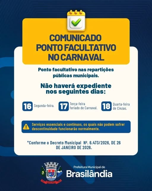 A Prefeitura de Brasilândia informa sobre o funcionamento dos serviços públicos no Carnaval. PONTO FACULTATIVO: Não haverá expediente nos dias: Segunda (16/02) Terça-feira de Carnaval (17/02) – Feriado Quarta-feira de Cinzas (18/02) SERVIÇOS ESSENCIAIS FUNCIONAM NORMALMENTE: Saúde, coleta de lixo, iluminação pública e demais serviços contínuos seguem sem interrupção. Retorno ao expediente normal: Quinta-feira (19/02). Aproveite o feriado com segurança e responsabilidade! *Decreto Municipal Nº 6.473/2026*