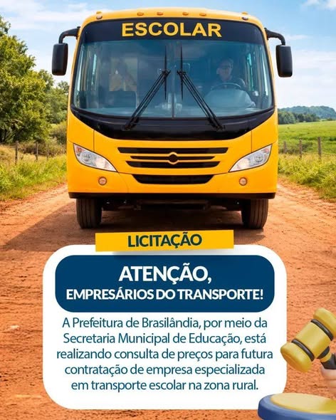 A Secretaria Municipal de Educação de Brasilândia está realizando consulta de preços para futura contratação de empresa(s) especializada(s) no transporte de alunos da zona rural durante o calendário letivo de 2026. Prazo para envio das propostas: até 19/02/2026 Como participar: Solicite a planilha de consulta pelo e-mail: [email protected] Preencha e devolva a proposta até 19/02/2026 pelo mesmo e-mail ou entregue presencialmente na sede da Secretaria. Entrega presencial: Secretaria Municipal de Educação – Paço Municipal Sobre o serviço: Transporte diário nos dias letivos, atendendo às rotas previamente definidas pela Secretaria, conforme…
