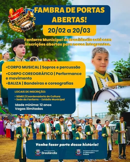 A Fanfarra Municipal de Brasilândia abre inscrições para quem quer fazer parte de um dos grupos culturais mais tradicionais da nossa cidade. Corpo Musical (sopros e percussão) Corpo Coreográfico Baliza De 20/02 a 20/03 Das 7h às 13h SEMEC/Cultura ou Sede da Fanfarra (Estádio Municipal) Idade mínima: 12 anos Vagas ilimitadas Atividade gratuita Não é preciso ter experiência. Os participantes serão acolhidos e direcionados conforme perfil e aptidão. Não esqueça os documentos: RG ou certidão do aluno, CPF do aluno, comprovante de residência, comprovante de matrícula, carteira de vacinação e…