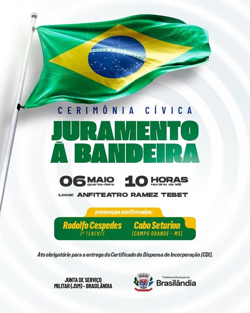 Atenção, jovens de Brasilândia! No dia 06 de maio, realizaremos a cerimônia de Juramento à Bandeira para os cidadãos alistados e dispensados do Serviço Militar. Este é um ato cívico obrigatório e indispensável para a entrega do seu Certificado de Dispensa de Incorporação (CDI). Sem este documento, não é possível assumir concursos públicos, tirar passaporte ou se matricular em universidades. Fique atento aos detalhes e não falte: Data: 06 de maio de 2026 Horário: 10h (MS) Local: Anfiteatro Ramez Tebet O evento é organizado pela Junta de Serviço Militar (JSM)…
