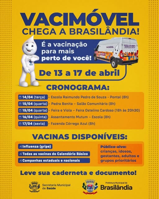 O Vacimóvel chega para facilitar o acesso de todos, com atenção especial aos grupos prioritários da Campanha da Gripe: Crianças menores de 6 anos Idosos com 60 anos ou mais Gestantes e puérperas Trabalhadores da saúde Professores Pessoas com doenças crônicas De 13 a 17 de abril Confira os locais e horários no card anterior Proteja quem você ama. Vacine-se!