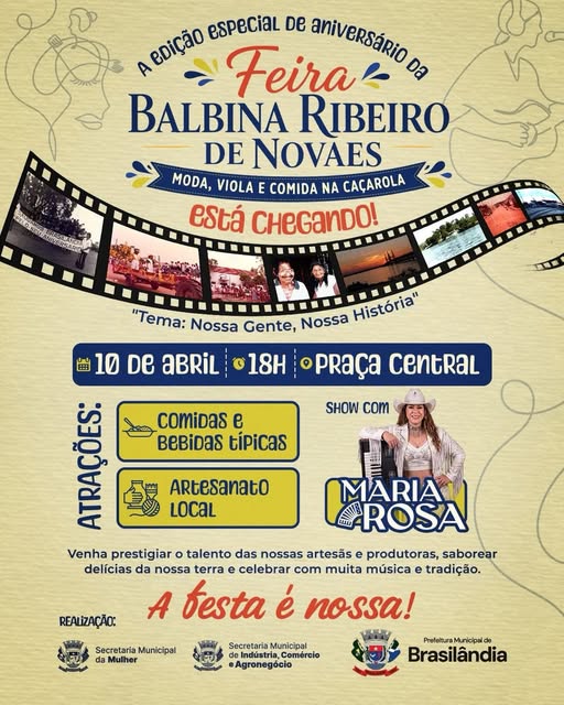 A Prefeitura de Brasilândia, por meio da Secretaria da Mulher, convida você para celebrar o aniversário da nossa cidade com a Edição Especial da Feira Balbina Ribeiro de Novaes e Moda, Viola e Comida na Caçarola. Data: 10 de abril (sexta-feira) Horário: a partir das 18h (MS) Local: Praça Central TEMA: Nossa Gente, Nossa História PROGRAMAÇÃO: Comidas e bebidas típicas da região Artesanato local produzido pela nossa cultura local Muita Música com o Gigante do Forró Venha saborear delícias da nossa terra, prestigiar o talento das nossas artesãs e celebrar…