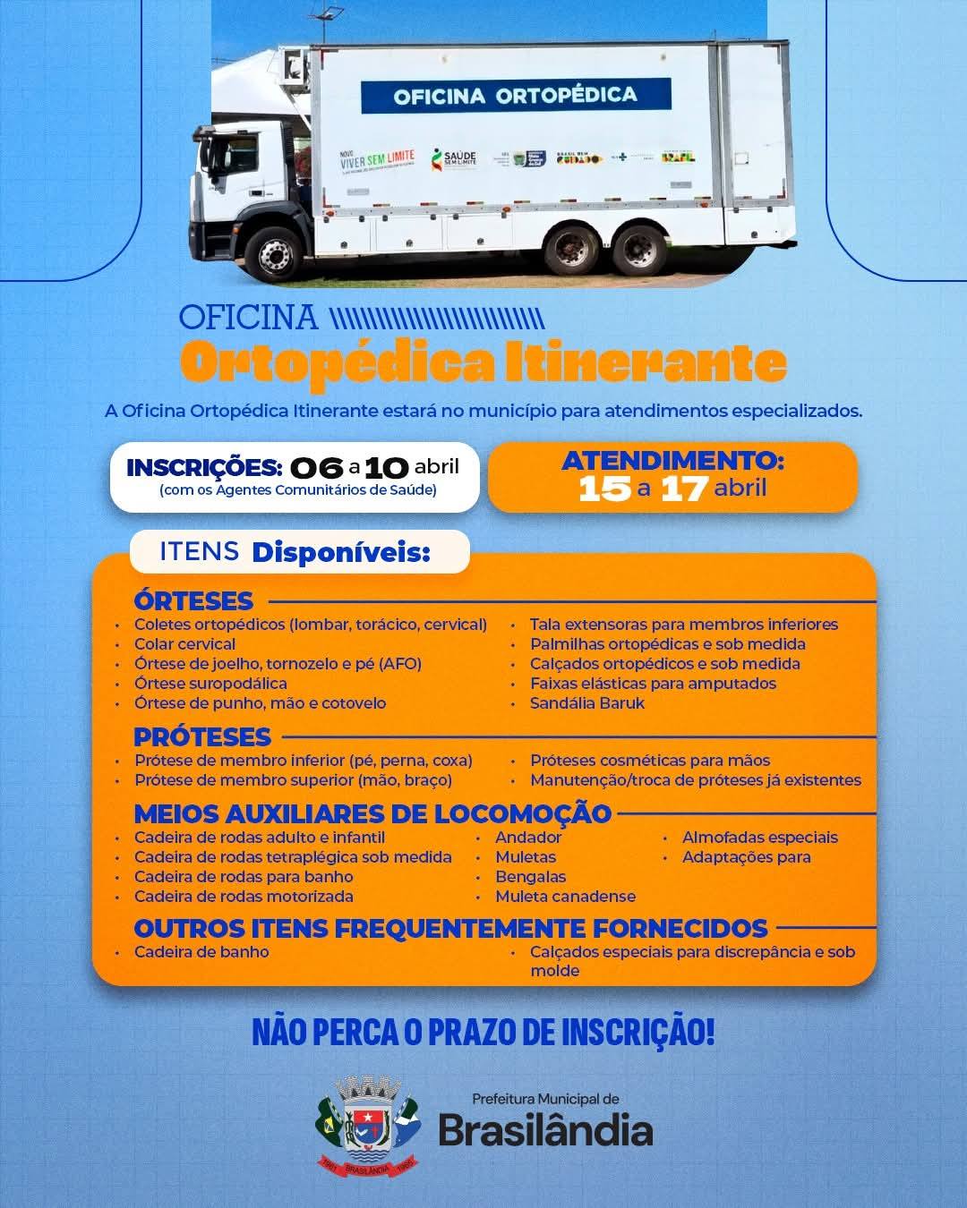 A Secretaria Municipal de Saúde informa que a Oficina Itinerante de Órteses, Próteses e Meios Auxiliares de Locomoção estará no município para atendimentos especializados. Atendimento: 15 a 17 de Abril Inscrições: 06 a 10 de abril (na Central de Regulação) A avaliação na oficina é obrigatória para a concessão dos itens. Órteses, próteses, cadeiras de rodas, andadores, muletas, CPAP, óculos e muito mais! Avaliação obrigatória na oficina.