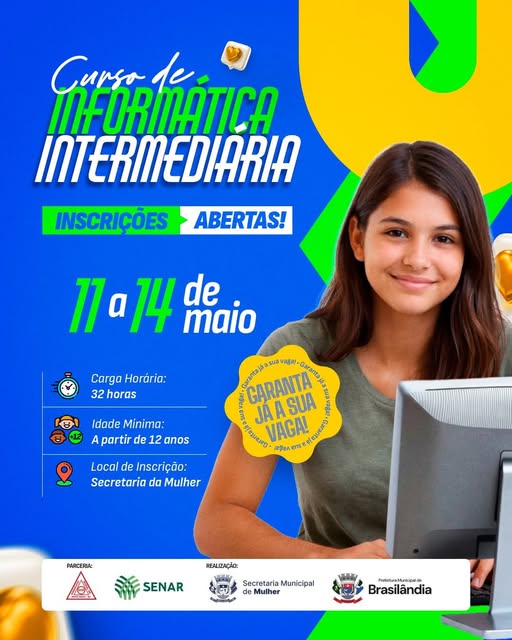 A Prefeitura de Brasilândia, através da Secretaria Municipal da Mulher, em grande parceria com o Sindicato Rural e instrutoria do SENAR, traz mais uma excelente oportunidade de qualificação gratuita: o curso de Informática Intermediária. Fique atento aos detalhes e não perca o prazo: Data do Curso: 11 a 14 de maio de 2026 Carga Horária: 32 horas Idade Mínima: A partir de 12 anos ATENÇÃO: Temos apenas 10 vagas disponíveis! A turma é reduzida para garantir o melhor aprendizado para todos. Como se inscrever? Procure a Secretaria da Mulher o…