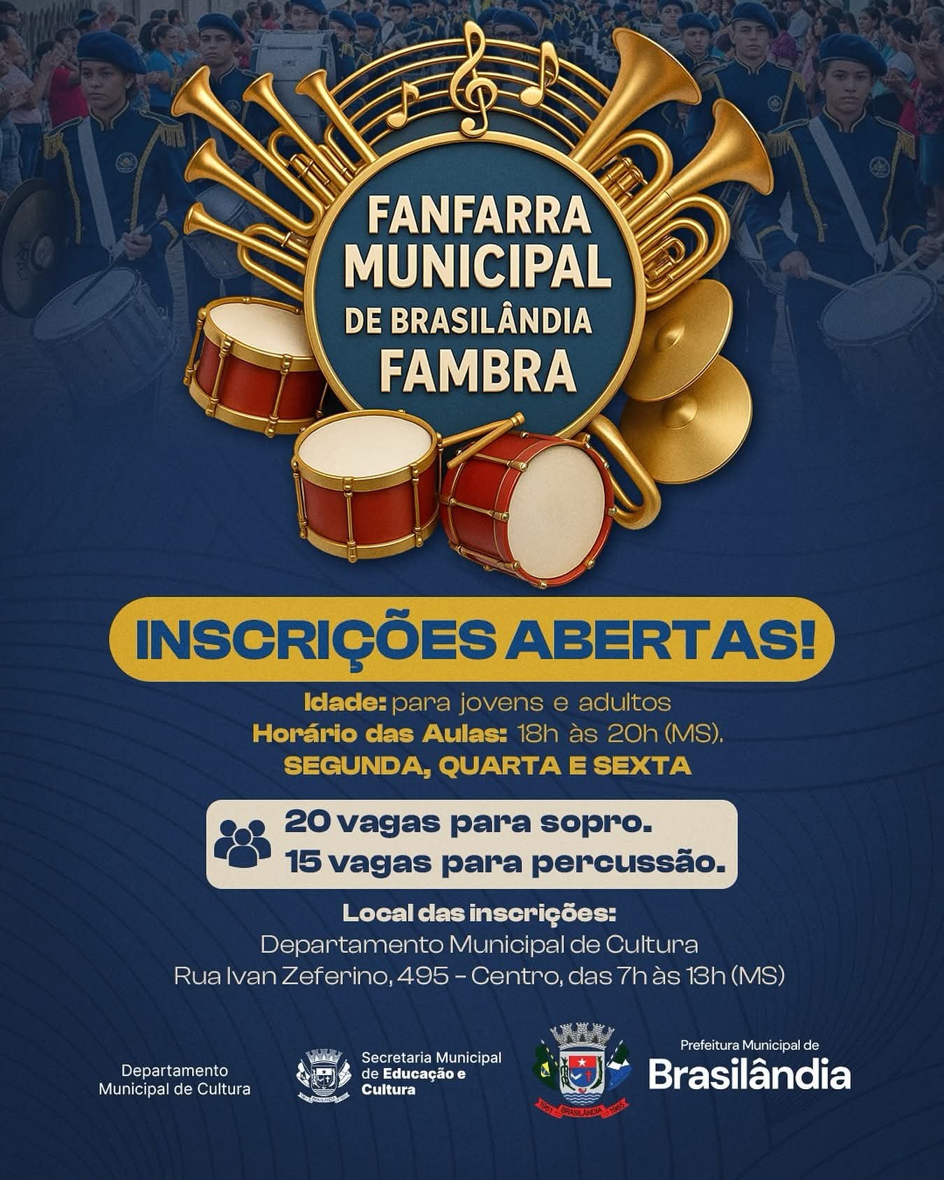 Você tem talento musical ou vontade de aprender? Então essa é a sua chance! Estão abertas as inscrições para a Fanfarra Municipal de Brasilândia – FAMBRA! As aulas são gratuitas e voltadas para jovens e adultos. Serão oferecidas: • 20 vagas para instrumentos de sopro • 15 vagas para percussão Aulas: Segundas, quartas e sextas Das 18h às 20h (MS) Local de inscrição: Departamento Municipal de Cultura – Rua Ivan Zeferino, 495 – Centro, das 7h às 13h (MS) Garanta sua vaga e venha fazer parte desse movimento cultural que…