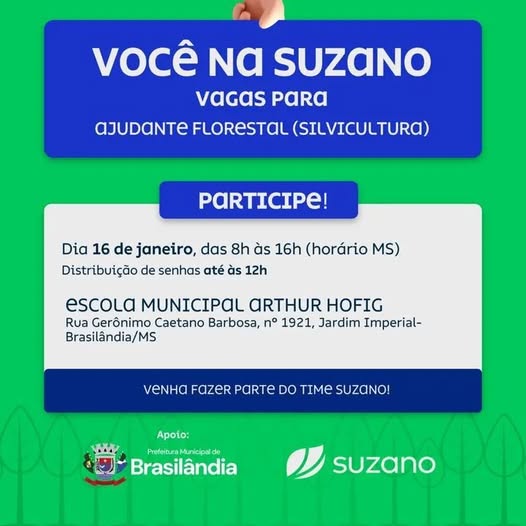 Se você está em busca de emprego, essa é a sua chance. A Prefeitura apoia o processo seletivo da Suzano para a vaga de Ajudante Florestal (Silvicultura). Confira as informações e não perca o horário: Dia: 16 de Janeiro (Sexta-feira) Local: Escola Municipal Arthur Hoffig (Jd. Imperial) Atendimento: Das 08h às 16h (MS) IMPORTANTE: As senhas serão distribuídas somente até às 12h. Chegue cedo e garanta seu atendimento! Marque aqui quem precisa saber dessa oportunidade!