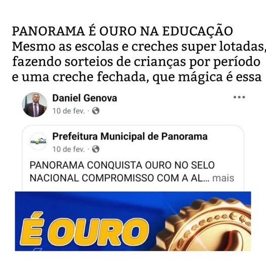 Prefeito Daniel Genova divulgou que Panorama é ouro da educação, com certeza vamos pagar as viagens igual o ano passado para ele receber o troféu. Quem veio a Panorama avaliar ? Viu as creches e escolas super lotadas ? Souberam que crianças estão sendo sorteadas por período de vagas ? Que os pais tendo dinheiro ou não são obrigados a comprar os uniformes ? Professores trabalhando com excesso de alunos, seja nas escolas ou creches, gerando sobrecarga de trabalho, adoecendo e prejudicando o aprendizado ? Creche fechada há mais de…