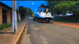 AJUDANTE GERAL DA PREFEITURA USA TRATOR PARA IR LAVAR OS BANHEIROS PÚBLICOS DO MUNICÍPIO