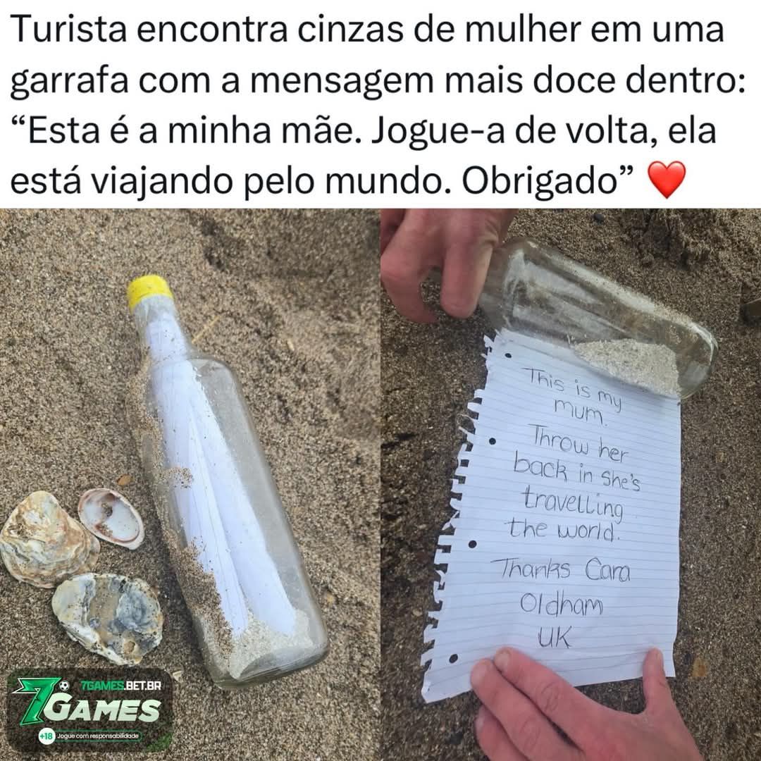 O gesto comovente viralizou e, embora a primeira viagem tenha sido curta, a garrafa foi devolvida ao mar — pronta para continuar sua aventura.