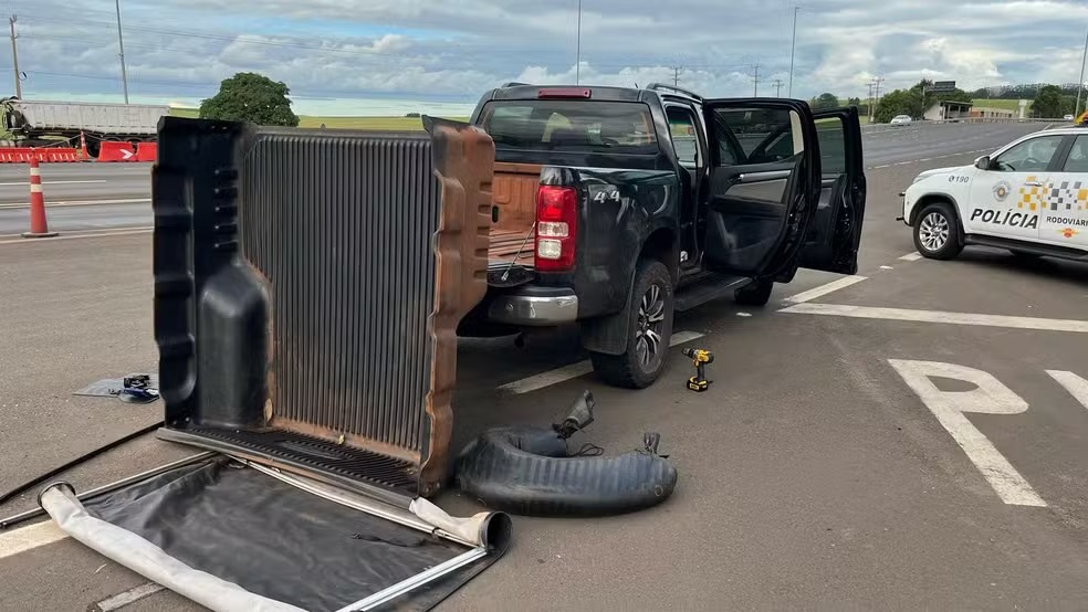 Durante a fiscalização, os militares localizaram um fundo falso abaixo da carroceria, contendo 514 tabletes de haxixe, com peso total de 53,600 quilos da droga.
