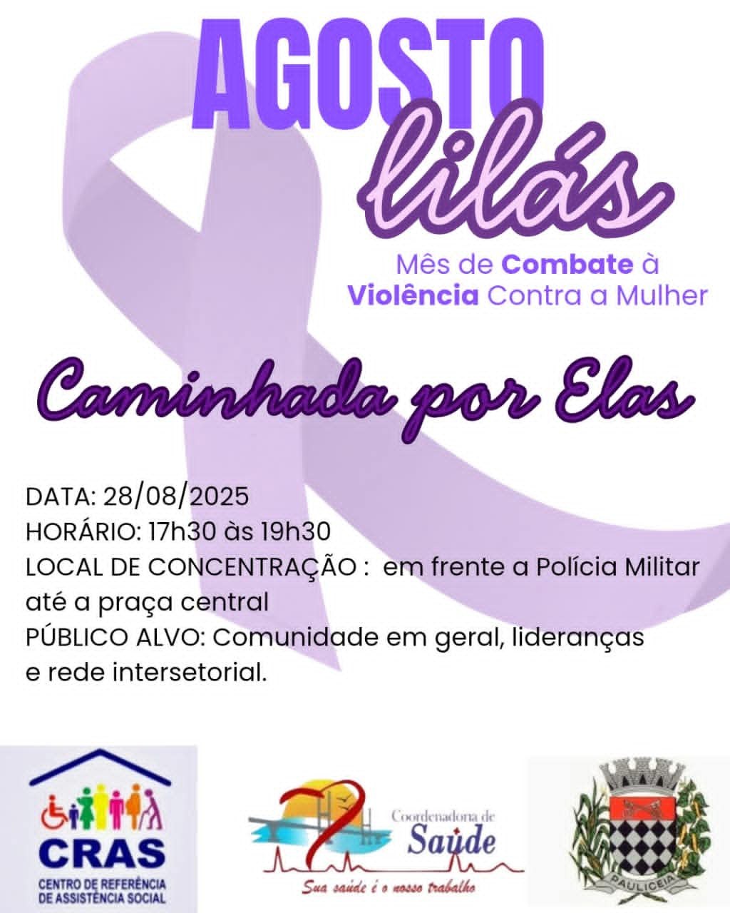 A Coordenadoria de Assistência Social em parceria com a rede intersetorial de Paulicéia, convida toda população de Paulicéia e convoca todos os Beneficiários do Bolsa família, Participantes das oficinas de Violão, Café com Prosa, Pintura em tecido, participante dos Programas e Projetos Criança Mais Feliz, Karatê, Capoeira, Banda Marcial e escolinha de Futebol, Beneficiários do Criança Feliz de Pauliceia, participantes do CCI e GRUPOS do PAIF/ CRAS para estarem presentes na 1ª Caminhada em Ação à Campanha Agosto Lilás – Violência contra a Mulher.