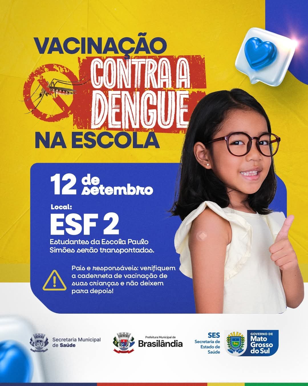 A Prefeitura de Brasilândia, através da Secretaria Municipal de Saúde, convoca todos os pais e responsáveis para levarem suas crianças para se vacinarem contra a dengue!
