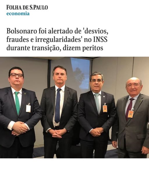 Fotografia colorida mostra Representantes dos peritos do INSS durante reunião com o então presidente eleito, Jair Bolsonaro, em 11 de dezembro de 2018 na sede da transição; na foto, Francisco Cardoso (então presidente da ANMP), Luiz Argolo (então vice-presidente) e Samuel Abranques (diretor sindical). Sobre a imagem há o texto: “Bolsonaro foi alertado de ‘desvios, fraudes e irregularidades’ no INSS durante transição, dizem peritos”