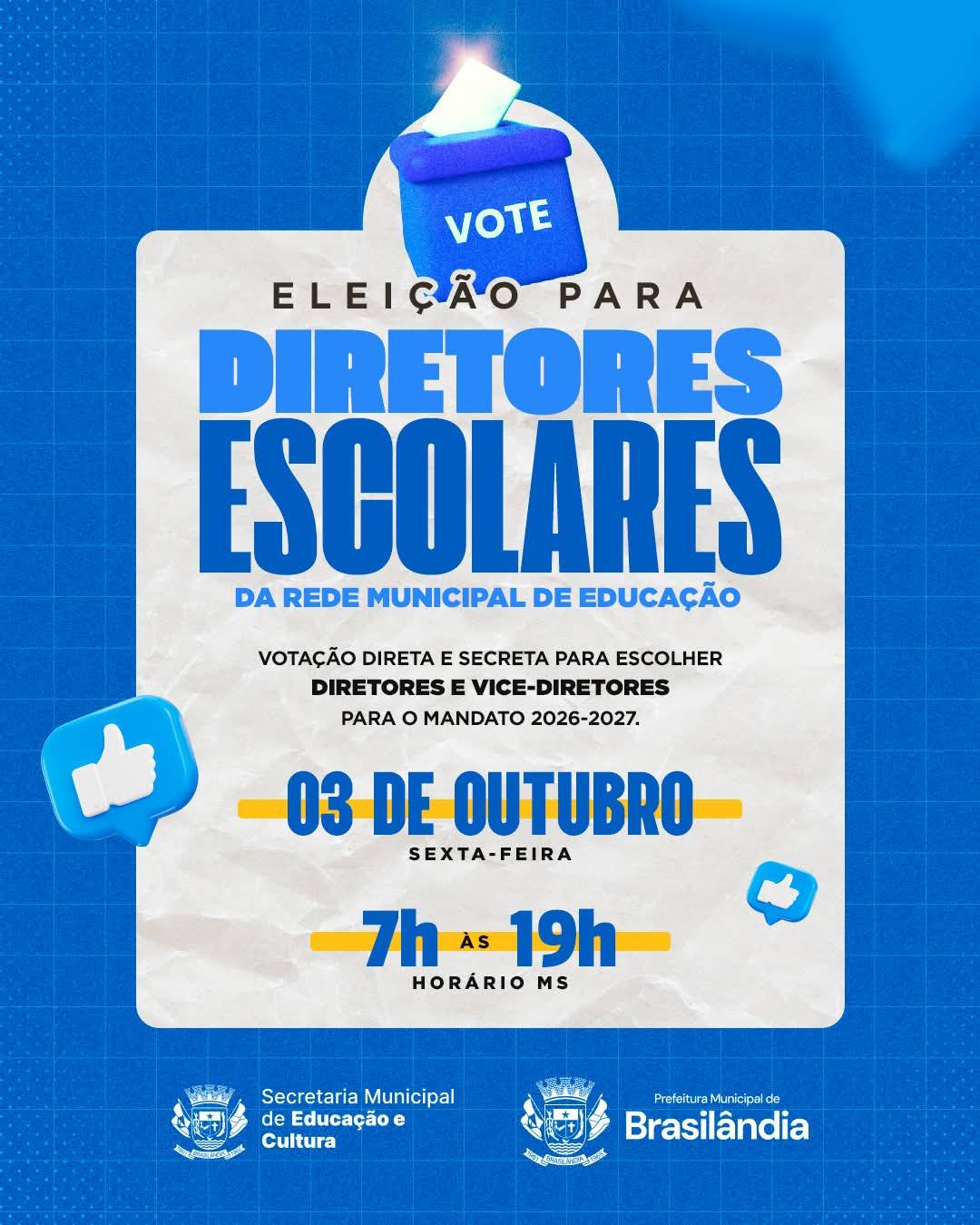 No dia 03 de outubro (sexta-feira), das 7h às 19h (MS), você é peça fundamental na eleição para diretores e vice-diretores da rede municipal de Brasilândia!