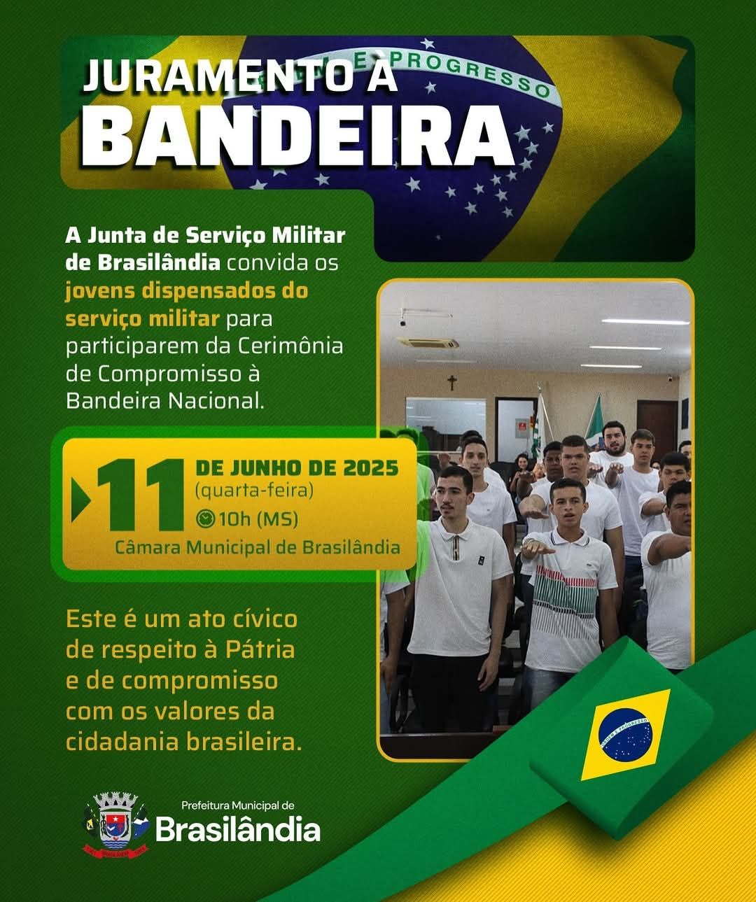 A Junta de Serviço Militar de Brasilândia realizará, no próximo dia 11 de junho de 2025, a tradicional Cerimônia de Juramento à Bandeira Nacional. O evento acontece às 10h (horário de MS), na Câmara Municipal de Brasilândia, e reunirá os jovens dispensados do serviço militar obrigatório, que são convidados a participar deste importante ato cívico.