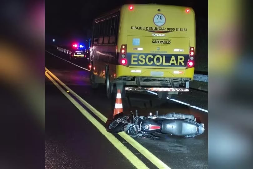 Na sequência, o motociclista perdeu o controle por causa da pista molhada, caiu e deslizou pela rodovia, parando sob um ônibus escolar da Prefeitura de Flórida Paulista, que vinha no sentido contrário.