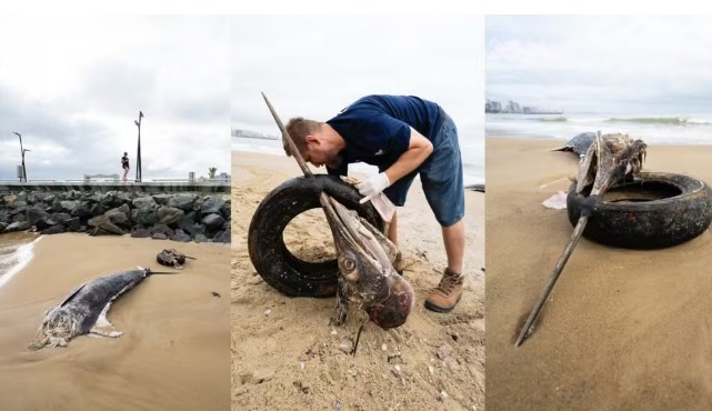 O peixe de grande porte encontrado com o bico atravessado em um pneu na Praia Central em Balneário Piçarras, no Litoral Norte de Santa Catarina, era um marlim-azul (Makaira nigricans), conhecido por ser um dos maiores peixes de bico do mundo e mais cobiçados da pesca oceânica.