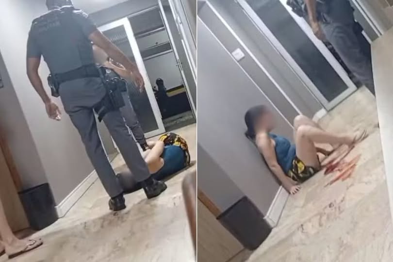 Imagens obtidas pelo g1 mostram a mulher deitada no corredor do prédio, com dois policiais ao redor. Em determinado momento, ela tenta segurar o pé de uma policial feminina, mas tem o rosto chutado pelo outro PM. O vídeo também mostra a mulher, vítima das agressões, com o rosto ensanguentado.