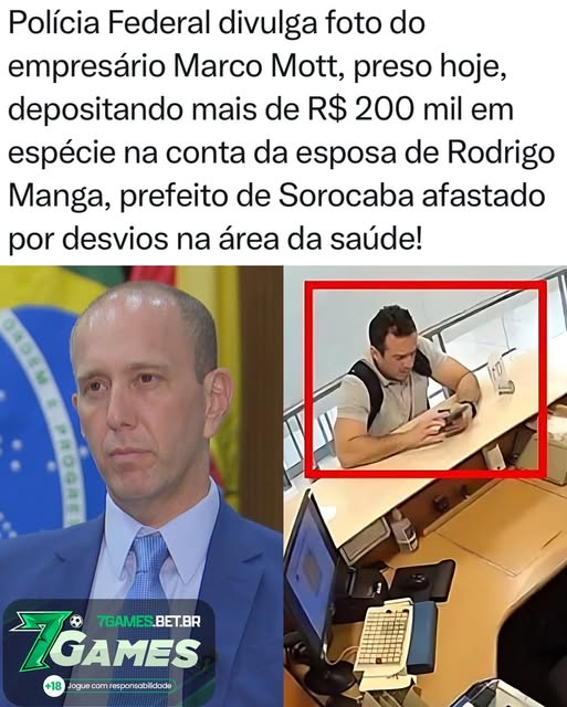 A Polícia Federal divulgou imagens que mostram o empresário Marco Mott, preso nesta quarta-feira (6), realizando um depósito de mais de R$ 200 mil em espécie na conta da esposa do prefeito afastado de Sorocaba, Rodrigo Manga, investigado por desvios de recursos da saúde pública.